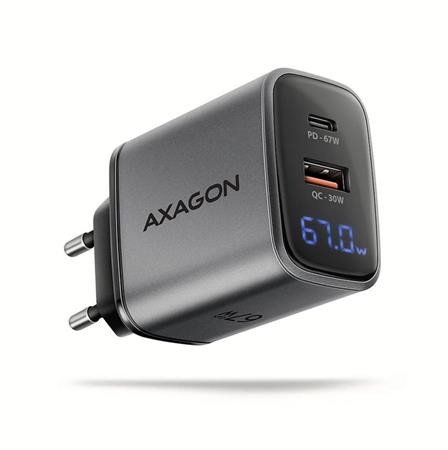 Cestovní nabíječka do sítě AXAGON ACU-PQ67D GaN umožňuje rychlé nabíjení až dvou mobilních zařízení současně. Díky celkovému výkonu 67 W dokáže nabíječka dobíjet notebooky, tablety, telefony a další mobilní zařízení nejvyšší možnou rychlostí. Adaptér nabízí nejen standardní USB-A konektor, ale také oboustranný USB-C konektor. Přehledný LCD displej zobrazuje aktuální výkon nabíjení.